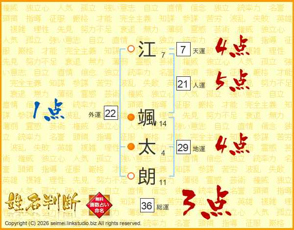 江(7画) 颯(14画)太(4画)朗(11画)