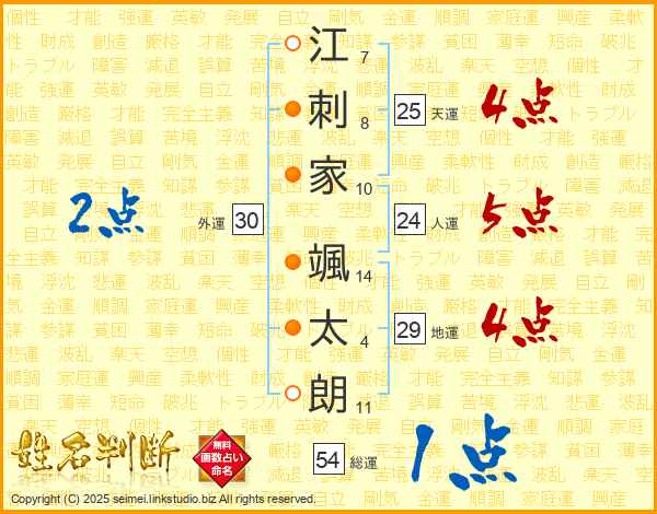 江(7画)刺(8画)家(10画) 颯(14画)太(4画)朗(11画)