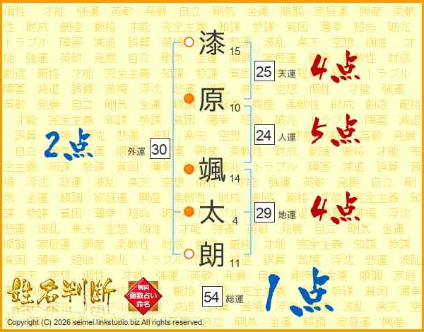 漆(15画)原(10画) 颯(14画)太(4画)朗(11画)