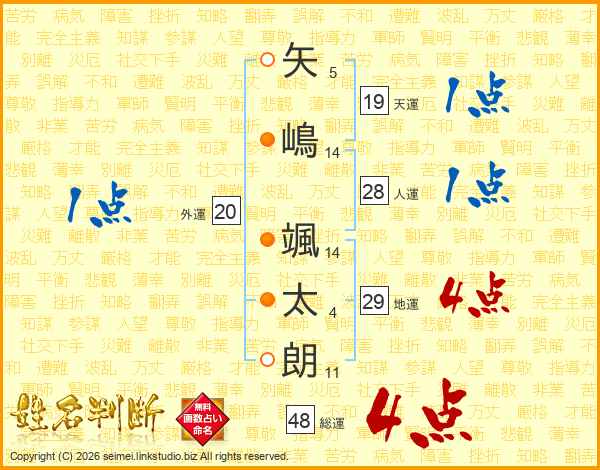 矢(5画)嶋(14画) 颯(14画)太(4画)朗(11画)