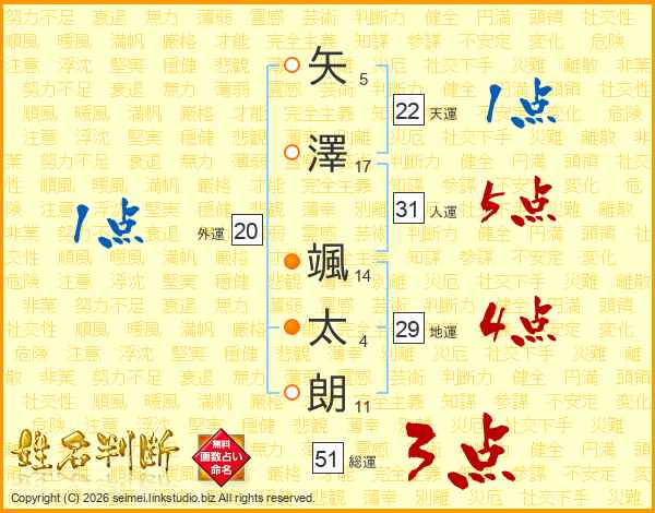 矢(5画)澤(17画) 颯(14画)太(4画)朗(11画)