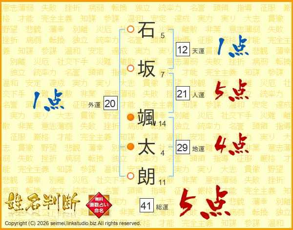 石(5画)坂(7画) 颯(14画)太(4画)朗(11画)