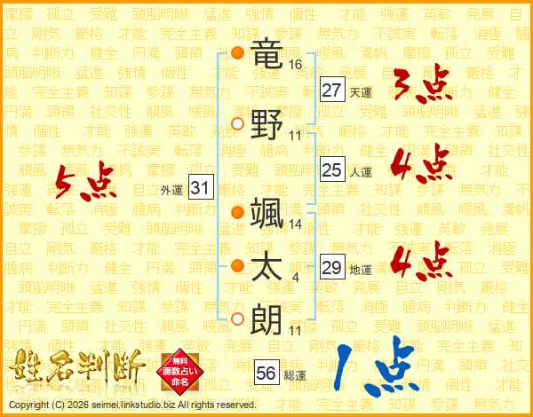 竜(16画)野(11画) 颯(14画)太(4画)朗(11画)
