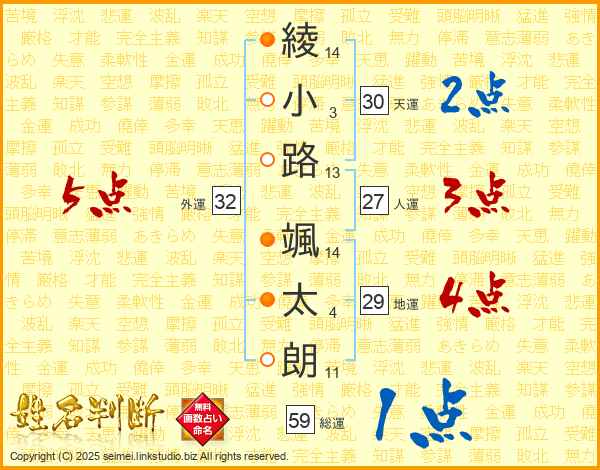 綾(14画)小(3画)路(13画) 颯(14画)太(4画)朗(11画)