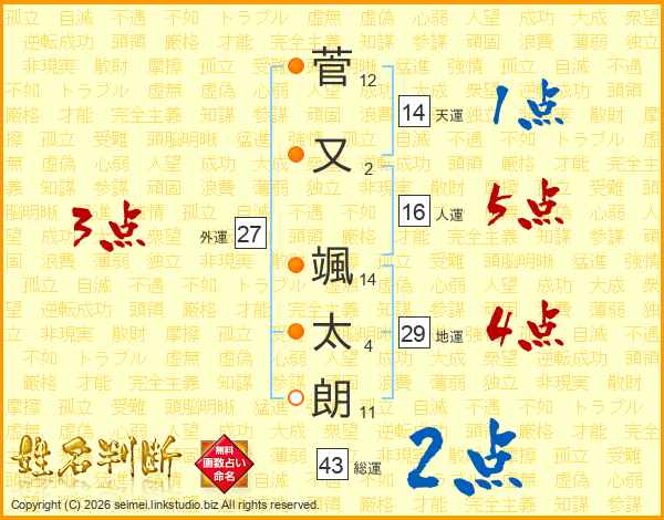 菅(12画)又(2画) 颯(14画)太(4画)朗(11画)