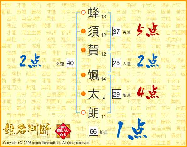 蜂(13画)須(12画)賀(12画) 颯(14画)太(4画)朗(11画)