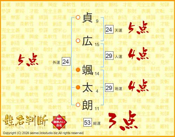 貞(9画)広(15画) 颯(14画)太(4画)朗(11画)