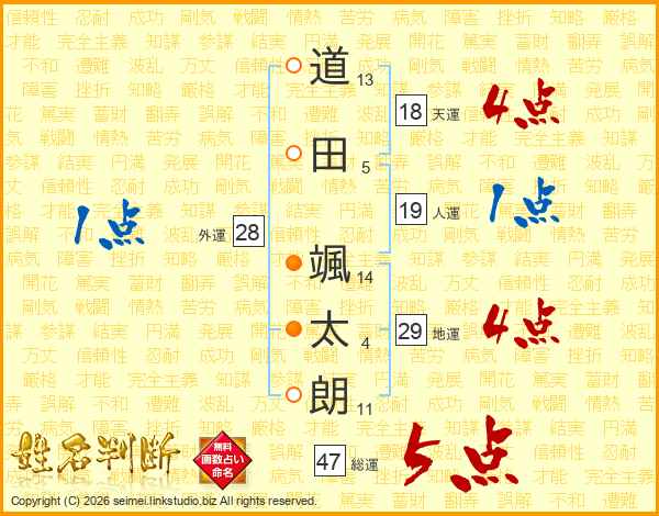 道(13画)田(5画) 颯(14画)太(4画)朗(11画)