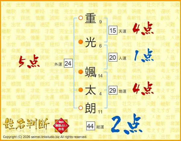 重(9画)光(6画) 颯(14画)太(4画)朗(11画)