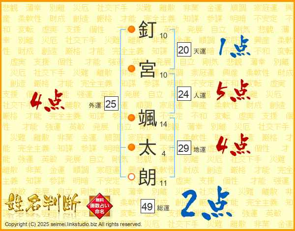 釘(10画)宮(10画) 颯(14画)太(4画)朗(11画)
