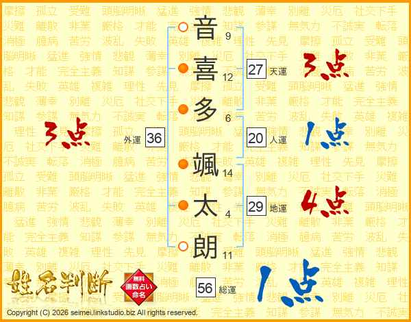音(9画)喜(12画)多(6画) 颯(14画)太(4画)朗(11画)