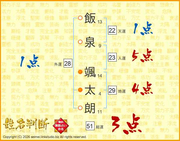 飯(13画)泉(9画) 颯(14画)太(4画)朗(11画)