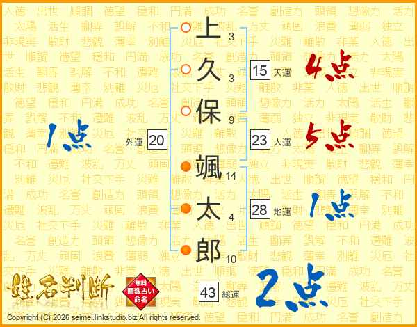 上(3画)久(3画)保(9画) 颯(14画)太(4画)郎(10画)