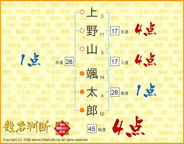 上(3画)野(11画)山(3画) 颯(14画)太(4画)郎(10画)