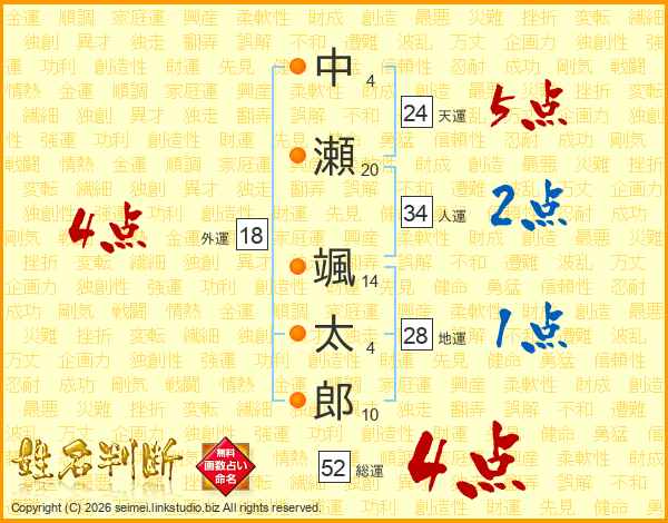 中瀬颯太郎さんの総運は52画の4点!