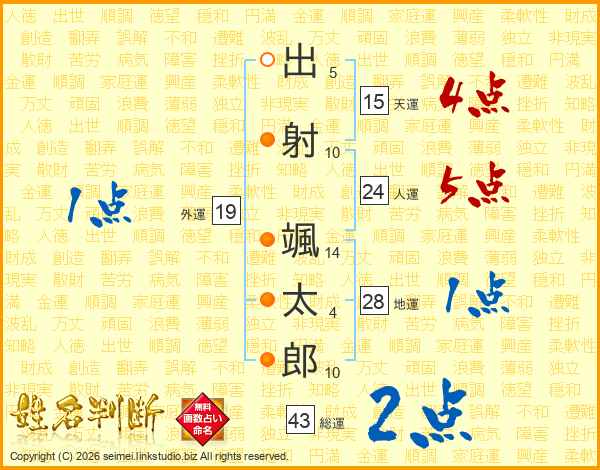 出(5画)射(10画) 颯(14画)太(4画)郎(10画)