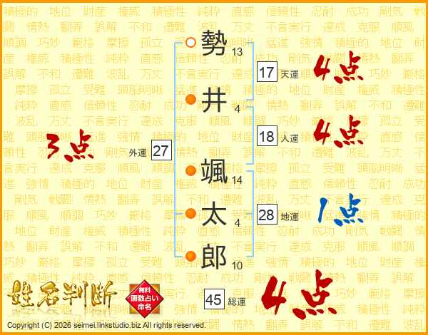 勢(13画)井(4画) 颯(14画)太(4画)郎(10画)