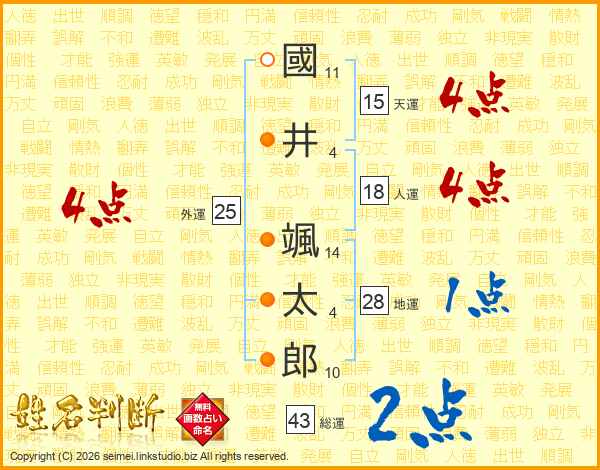 國(11画)井(4画) 颯(14画)太(4画)郎(10画)