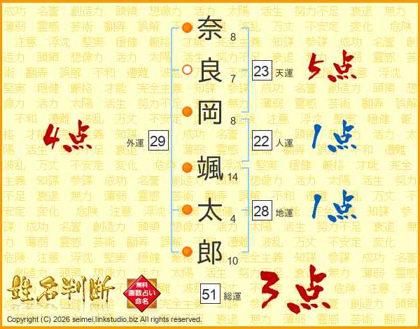 奈(8画)良(7画)岡(8画) 颯(14画)太(4画)郎(10画)