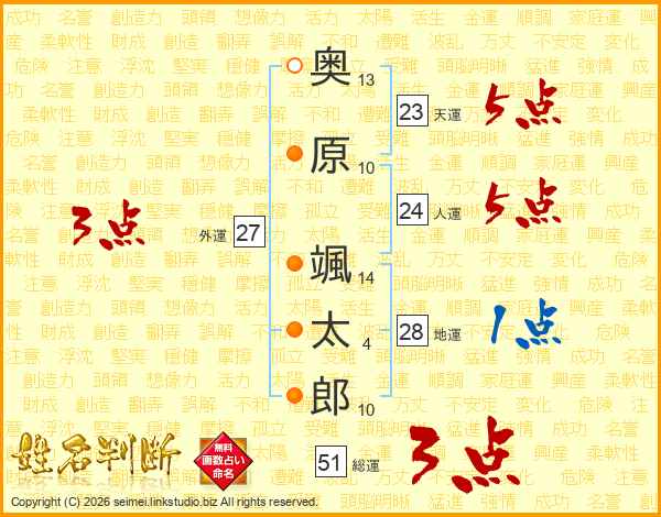 奥(13画)原(10画) 颯(14画)太(4画)郎(10画)