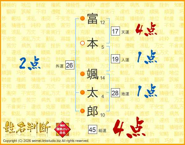 富(12画)本(5画) 颯(14画)太(4画)郎(10画)