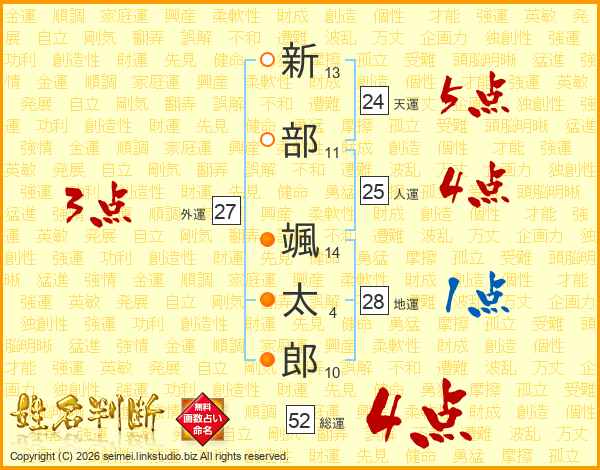 新(13画)部(11画) 颯(14画)太(4画)郎(10画)