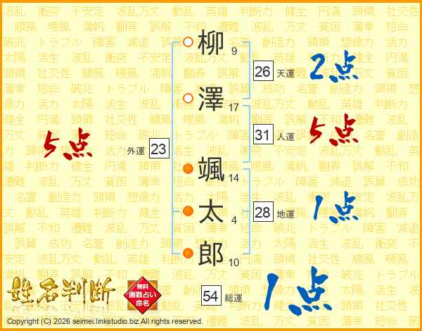 柳澤颯太郎さんの人運は31画の5点!