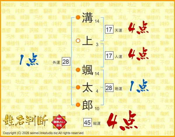 溝(14画)上(3画) 颯(14画)太(4画)郎(10画)