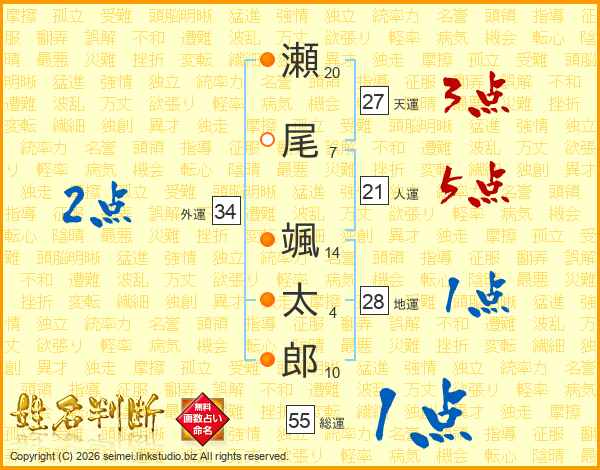瀬(20画)尾(7画) 颯(14画)太(4画)郎(10画)
