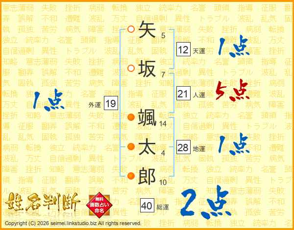 矢(5画)坂(7画) 颯(14画)太(4画)郎(10画)