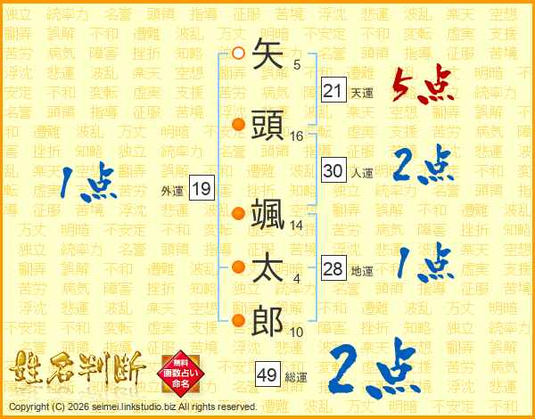 矢(5画)頭(16画) 颯(14画)太(4画)郎(10画)