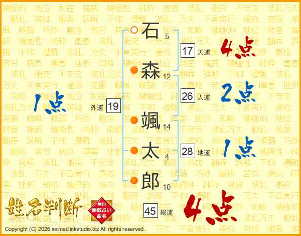 石(5画)森(12画) 颯(14画)太(4画)郎(10画)