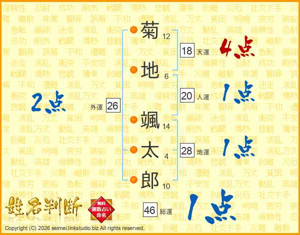菊(12画)地(6画) 颯(14画)太(4画)郎(10画)
