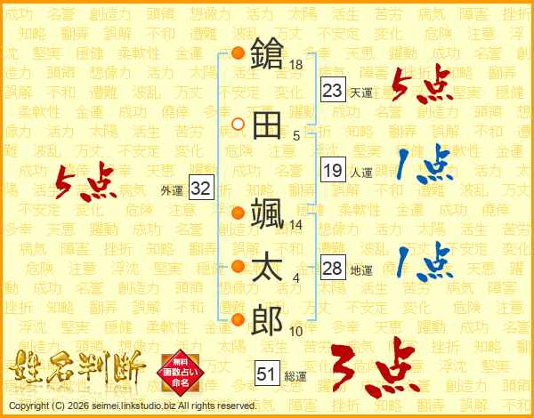 鎗田颯太郎さんの天運は23画の5点!