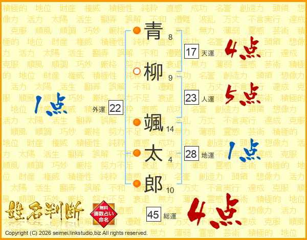 青柳颯太郎さんの総運は45画の4点!