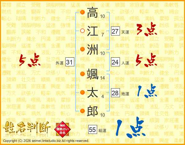 高(10画)江(7画)洲(10画) 颯(14画)太(4画)郎(10画)