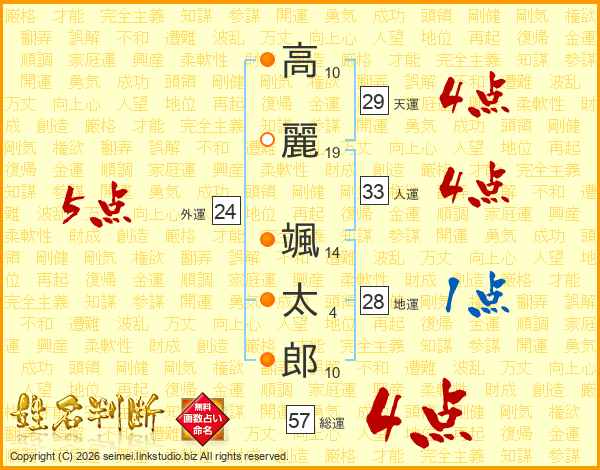高(10画)麗(19画) 颯(14画)太(4画)郎(10画)