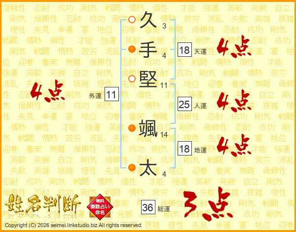 久(3画)手(4画)堅(11画) 颯(14画)太(4画)