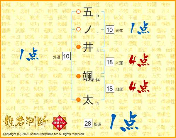 五(5画)ノ(1画)井(4画) 颯(14画)太(4画)