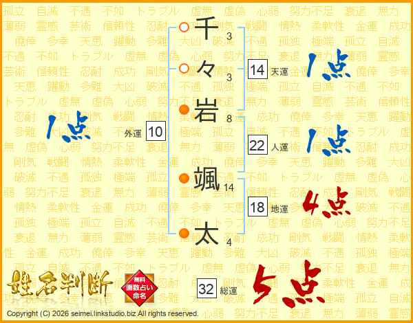 千(3画)々(3画)岩(8画) 颯(14画)太(4画)