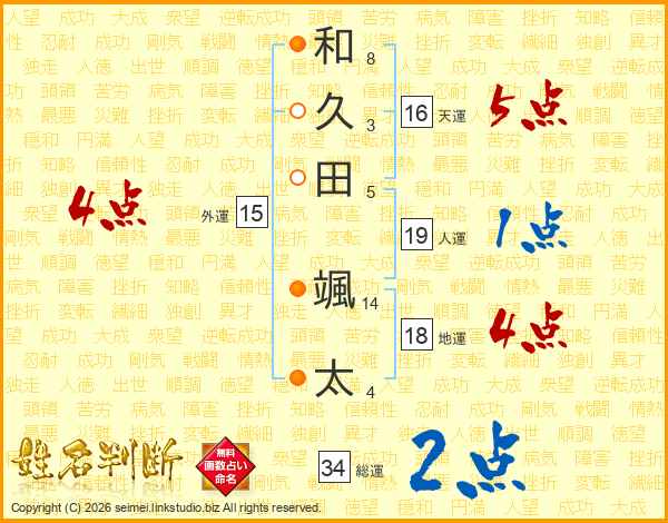 和(8画)久(3画)田(5画) 颯(14画)太(4画)