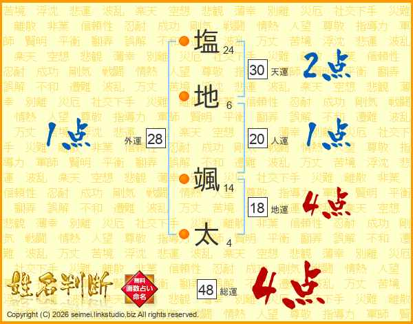塩(24画)地(6画) 颯(14画)太(4画)