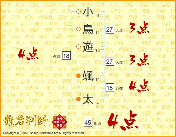 小(3画)鳥(11画)遊(13画) 颯(14画)太(4画)