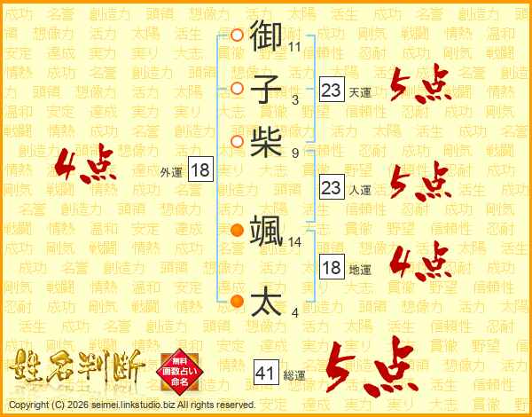 御(11画)子(3画)柴(9画) 颯(14画)太(4画)