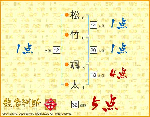松(8画)竹(6画) 颯(14画)太(4画)