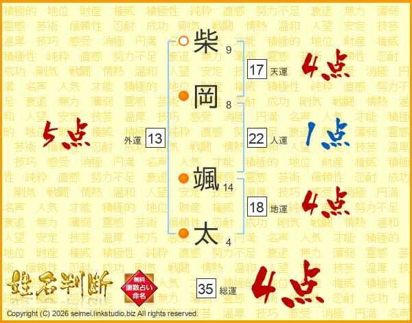柴(9画)岡(8画) 颯(14画)太(4画)