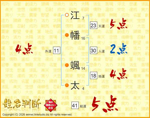 生活面を象徴する運勢です。外部から受ける影響力を表し、結婚運、家庭運や職場、環境への順応性を表します。総運から人運を引いた画数。姓や名が1文字の場合を除く。