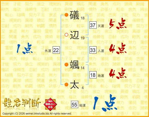 礒(18画)辺(19画) 颯(14画)太(4画)