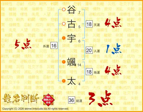 谷(7画)古(5画)宇(6画) 颯(14画)太(4画)
