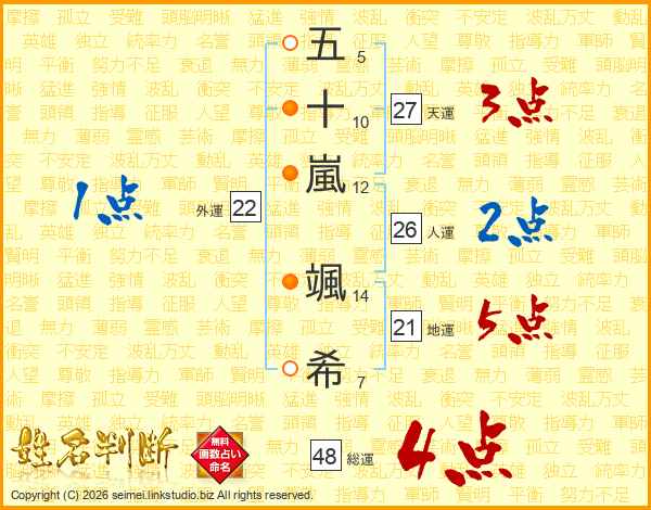 五(5画)十(10画)嵐(12画) 颯(14画)希(7画)